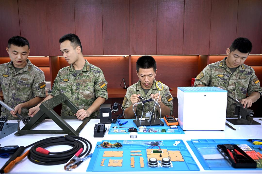 圖為火箭軍某旅發(fā)射二營官兵在“淬鋒”創(chuàng)新工作室,開展技術(shù)革新活動。劉明松 攝