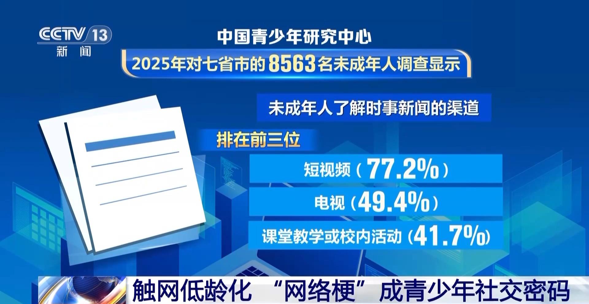中國(guó)青少年研究中心2025年對(duì)七省市的8563名未成年人調(diào)查顯示,未成年人了解時(shí)事新聞的渠道排在前三位的分別是短視頻(77.2%)、電視(49.4%)、課堂教學(xué)或校內(nèi)活動(dòng)(41.7%)。